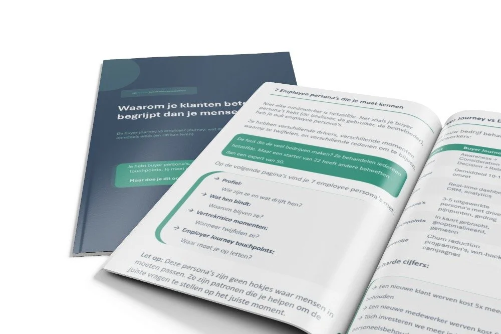 Dit e-book laat zien hoe je dezelfde marketinglogica toepast op je eigen team. Inclusief 7 employee personas, vertrekrisico-momenten en praktische handvatten om personeelsbehoud te verbeteren.